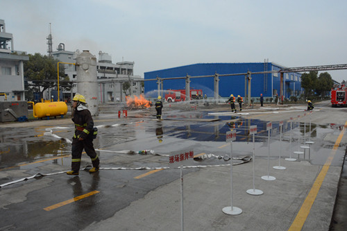 本次演練分為技能表演賽和事故演練兩個(gè)部分。技能表演賽由本公司專職消防隊(duì)員參加實(shí)施,內(nèi)容包括:“原地佩戴空呼器、水帶出水實(shí)操、著消防服堵漏”三個(gè)消防技能項(xiàng)目;事故演練部分內(nèi)容分為“車間制冷工段液氨泄露事故應(yīng)急救援演練”和“生產(chǎn)車間火災(zāi)事故應(yīng)急救援演練”兩個(gè)項(xiàng)目,演練人員由南湖區(qū)消防大隊(duì)、大橋鎮(zhèn)、中華化工專職消防隊(duì)三支訓(xùn)練有素的消防隊(duì)伍組成,中華化工企業(yè)職工、南湖區(qū)安監(jiān)局、環(huán)保局等相關(guān)工作人員共計(jì)50余人參加了事故應(yīng)急救援演練。