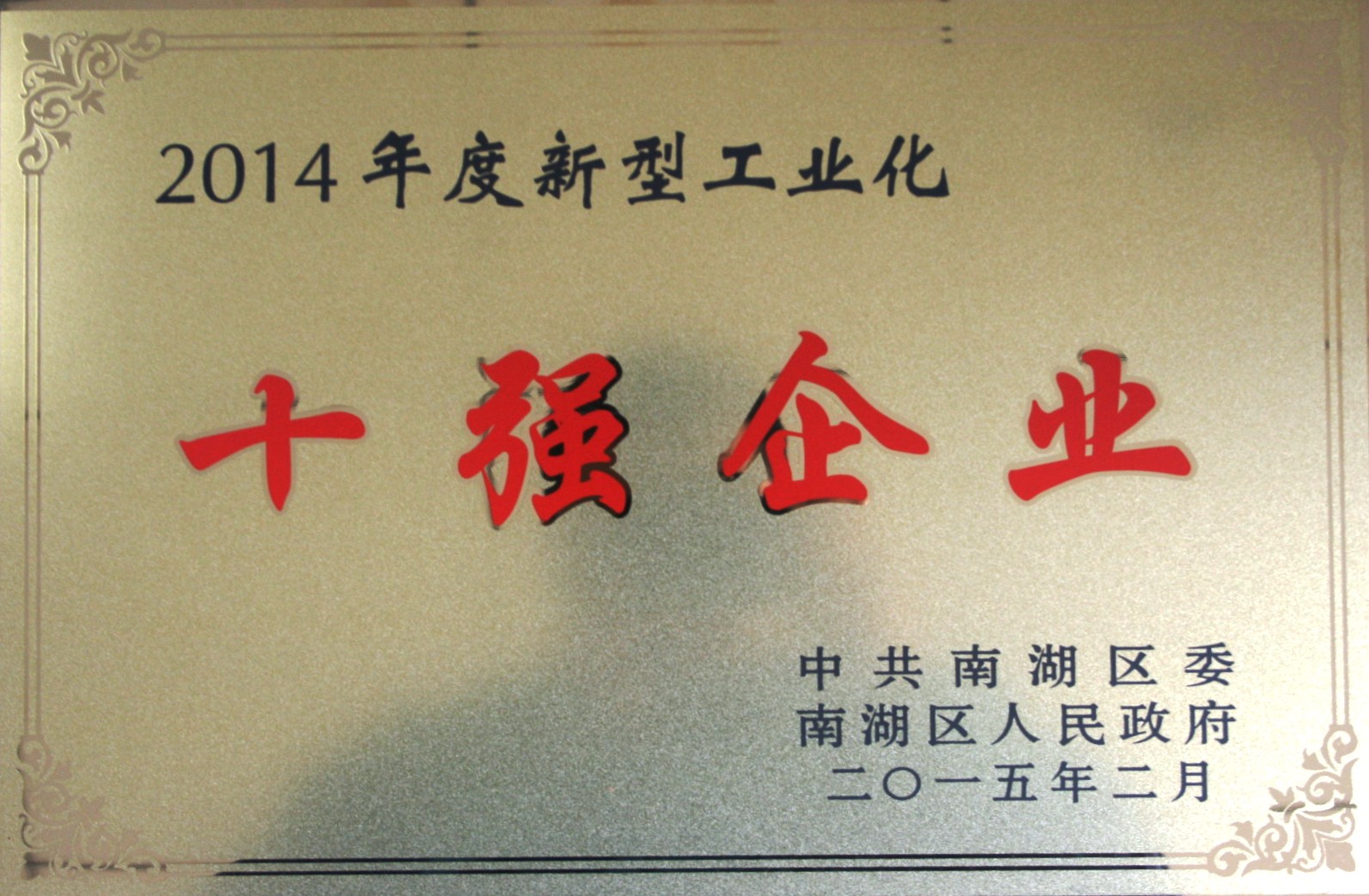 2015年2月28日召開的南湖區(qū)三級干部暨機(jī)關(guān)干部大會上,我公司憑借良好的業(yè)績,榮獲了“2014年度走新型工業(yè)化道路十強(qiáng)企業(yè)”榮譽(yù)稱號。朱貴法榮譽(yù)董事長榮獲“2014年度走新型工業(yè)化道路優(yōu)秀企業(yè)家”、“2014年度南湖區(qū)慈善之星”榮譽(yù)稱號。