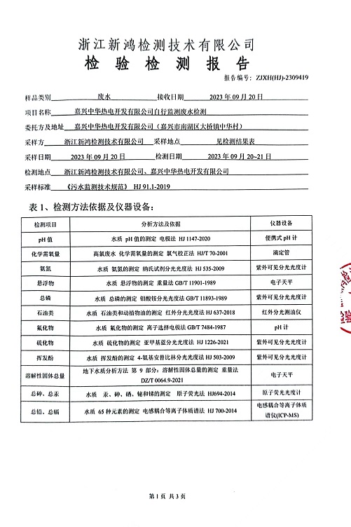 報(bào)告名稱:中華熱電2023.9月廢水檢測報(bào)告